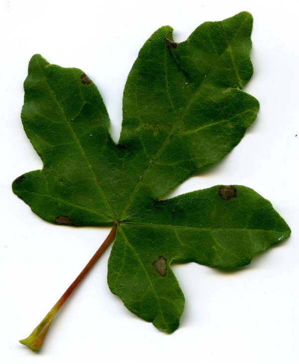 Field maple, Acer campestre grows on both sides of the path. Field maple is a small tree or bush and, unlike its relative the sycamore, is a true English native. The leaves are very like those of sycamore, although much smaller - see illustration below. In spring look for a blooming crab apple on the left side of the path.