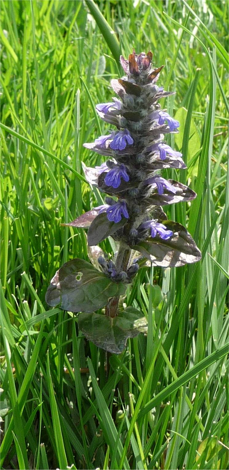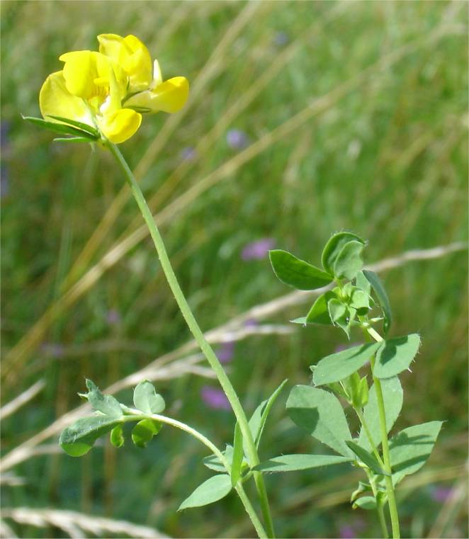 As we descend The Greensward, the soil becomes less acid, and the composition of the grassland flora changes subtly. Look out for the blue flower spikes of bugle Ajuga reptans - see illustration below - and the tiny white flowers of lesser stitchwort Stellaria graminea. Lesser stitchwort, which flowers from May through August, has five petals, but each is so deeply divided that at first glance one would say that the flower has ten petals. Later in the year (June through September) look for birds foot trefoil Lotus corniculatus - see illustration below. The flowers are like those of peas and when fully open are bright yellow, but as they open the petals are tinged bright orange, giving the plant its alternative name of bacon and egg plant.