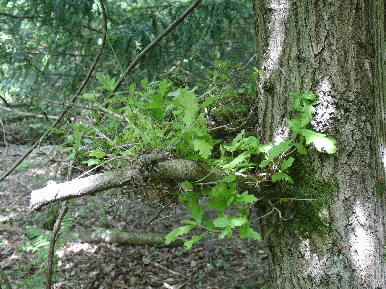 The young oak tree ahead and to the left has masses of small twigs growing out of the trunk and side branches producing shaggy clusters known as witches’ brooms. Witches’ brooms are formed by many species of trees in response to a wide variety of stress events; it might be a gall-forming insect or mite, aphids or bacterial/fungal colonisation or even mistletoe which sets it off.
