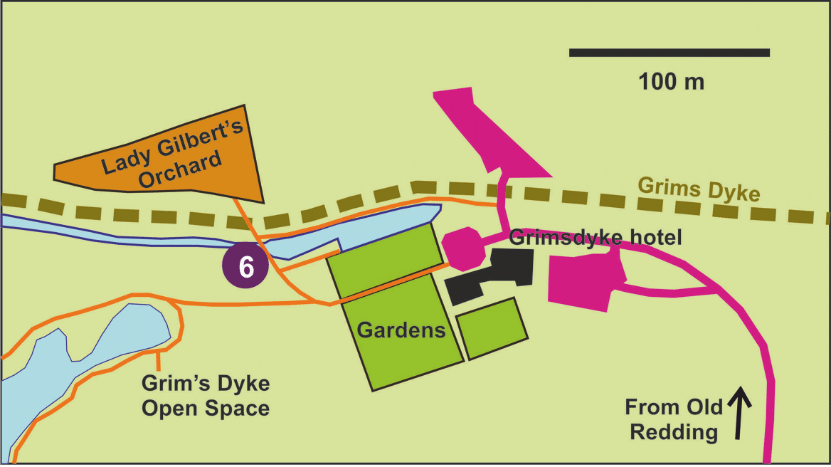 | The sketch map to the right shows the orchard in relation to Grimsdyke hotel and its gardens. From post 6, cross the bridge over the narrow water feature to reach the orchard. |