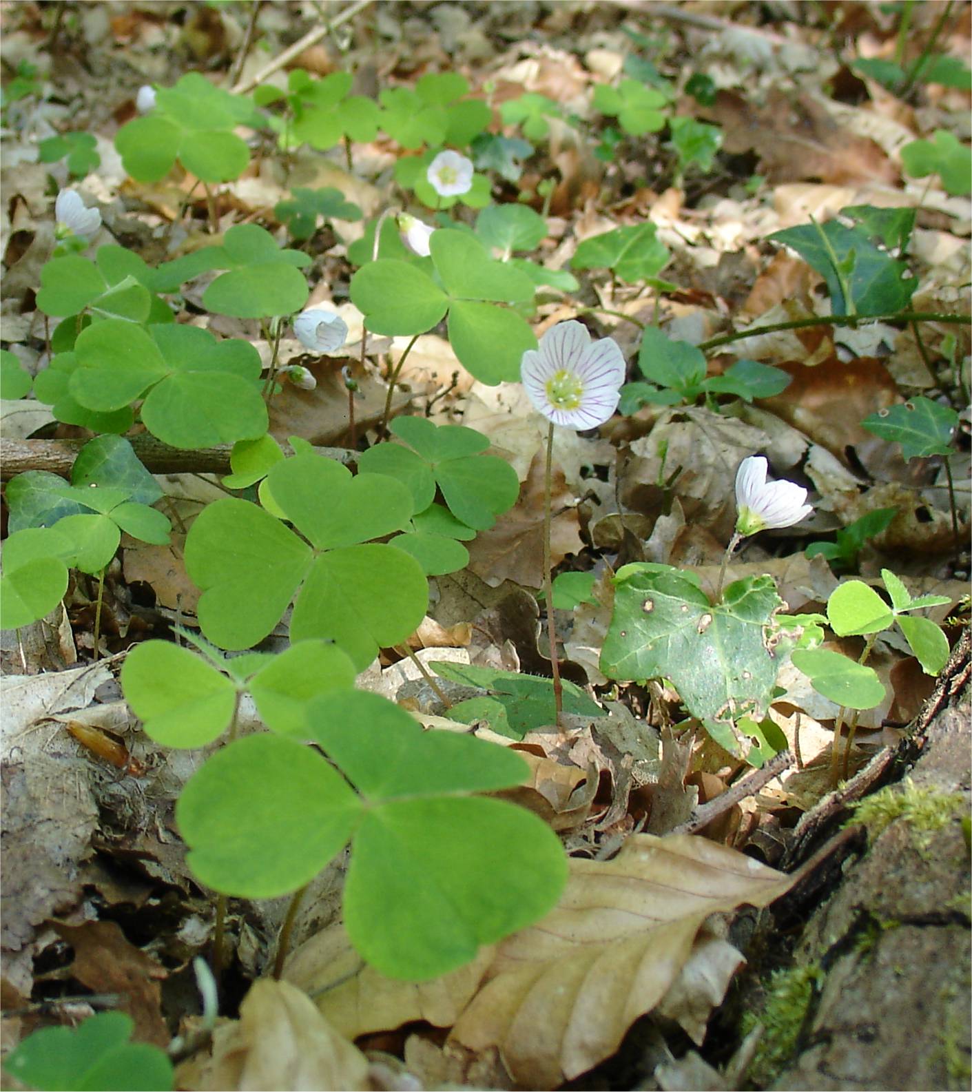As you leave the boardwalk and begin climbing the slope look on the right in spring for wood-sorrel Oxalis acetosella. The leaves have three independent leaves, like clover, and the very pretty white flowers appear in April and May.