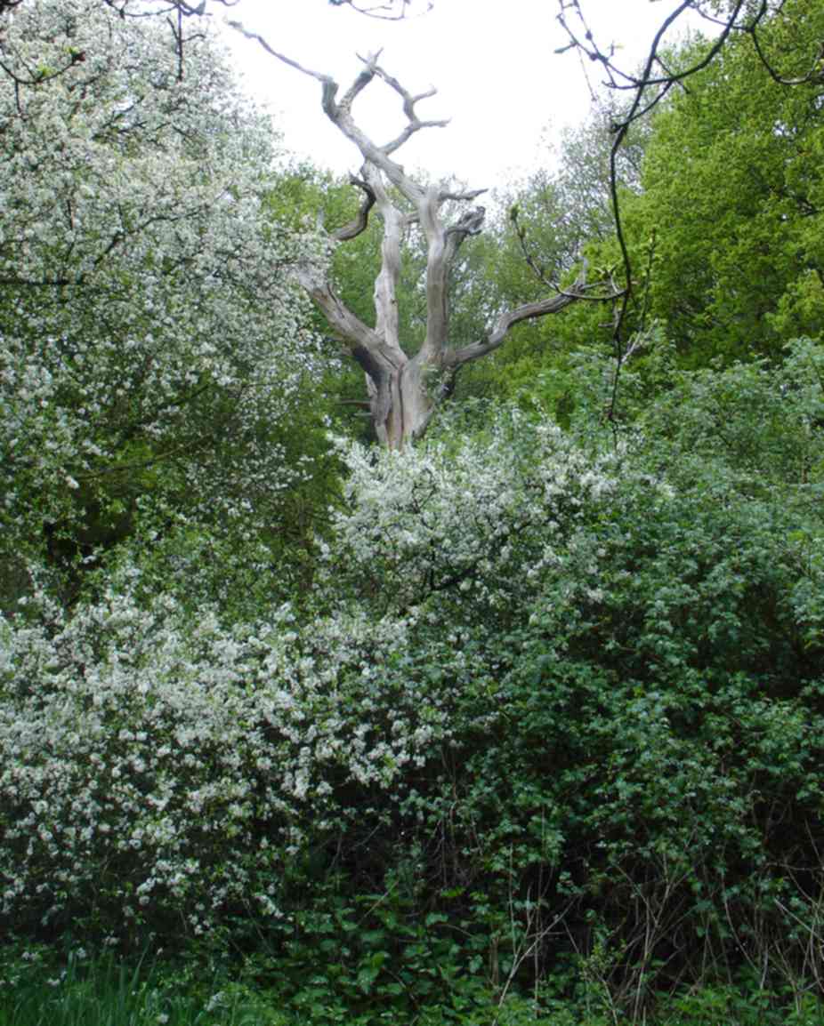 Most of the woodland is formed largely of relatively young oak, birch and sycamore, with sporadic occurrences of rowan, holly, english elm, hawthorn and elder in the shrub layer. The wild service tree, which is relatively rare in London, is also found. Other areas of woodland are more open and contain mature beech, hornbeam and oak, with an understorey of holly, birch, elder and hawthorn. Hornbeam, in particular, is more characteristic of ancient woodland, so these sections have probably been wooded for many centuries. Blackthorn with its savage thorns is common throughout the reserve, especially in wet areas along the streams. In April its white flowers on the bare stems are an early promise of Spring; later it bears small bitter plums called sloes that can be used to flavour gin.